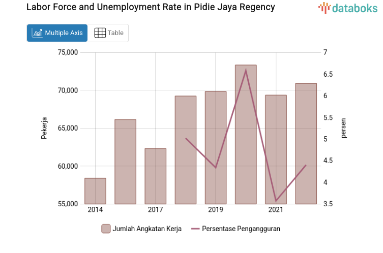 The reduction in the open unemployment rate (OUR) this year can be seen from the condition of the number of the workforce and the number of employed people. The number of the workforce in Pidie Jaya Regency has increased over the past three years. Historically, in 2021, there were 69,359 workers; in 2022, this increased to 70,905 workers; and in 2023, it was recorded at 73,248 workers.