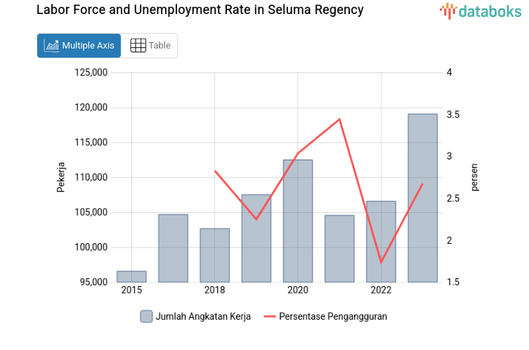 The increase in the open unemployment rate (OUR) is related to the data on the number of workers in this region. The number of workers in Seluma Regency has shown an upward trend over the past 16 years and continued after COVID-19. Over the past four years, the number of workers has also shown an upward trend. In 2021, the number of workers was recorded at 104,560, and in 2023, it increased to 119,050.