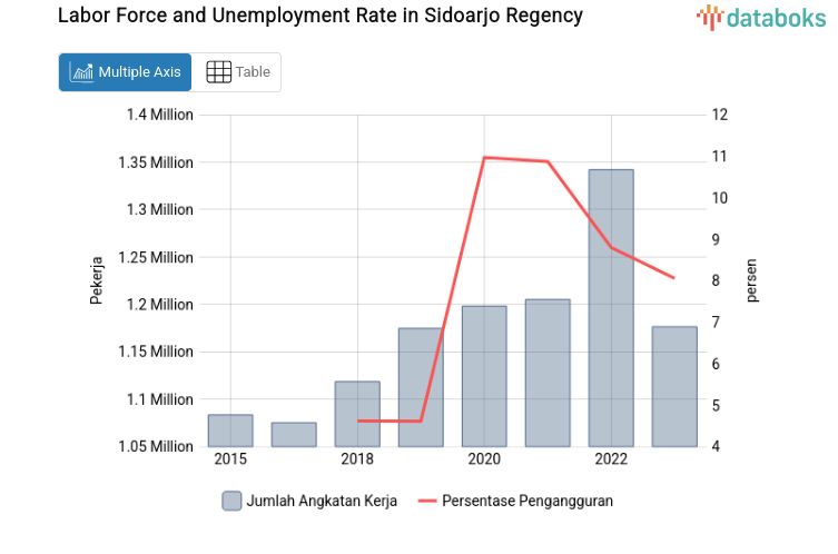 This decrease in the OUR is reflected in the number of employed people and the labor force published by BPS this year. The labor force in Sidoarjo Regency has decreased over the past three years. Historically, in 2021 there were 1.21 million workers, increasing to 1.34 million in 2022, and decreasing to 1.18 million in 2023.
