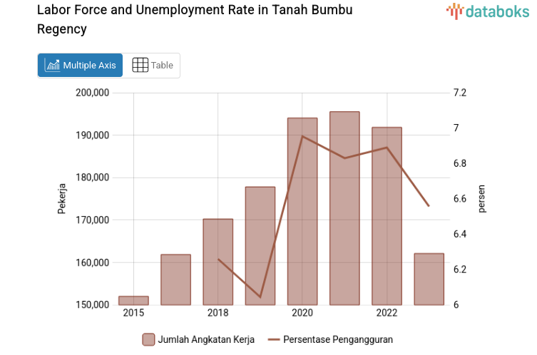 The reduction in the open unemployment rate (OUR) this year can be seen from the number of the workforce and the number of employed people. The number of the workforce in Tanah Bumbu Regency has shown an upward trend over the past 16 years. In 2021, the workforce was recorded at 195,500 workers, then decreased to 162,120 workers in 2023.