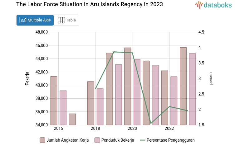 The decrease in the open unemployment rate (TPT) is reflected in the number of working people and the labor force figures published by BPS this year. The labor force in Aru Islands Regency has increased over the past three years. Historically, in 2021, there were 43,673 workers; this number decreased to 42,182 in 2022 and increased to 45,676 in 2023.