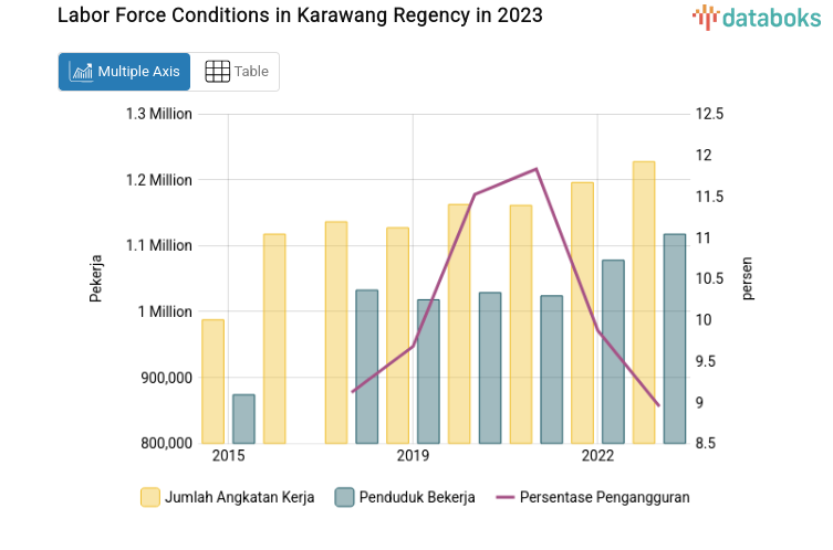 The reduction in the open unemployment rate (TPT) this year can be seen from the condition of the number of the workforce and the number of working people. The number of the workforce in Karawang Regency has shown an upward trend over the last 16 years. In 2021, the number of the workforce was recorded at 1.16 million, increasing to 1.23 million in 2023.