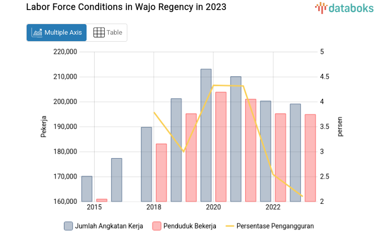 The reduction in the open unemployment rate (OUR) this year can be seen from the condition of the labor force and the number of employed people. The number of workers in Wajo Regency has shown an upward trend over the last 16 years. In 2021, the number of workers was recorded at 210,060. However, this number decreased by 1,198 workers from the previous year, reaching 199,080 in 2023.