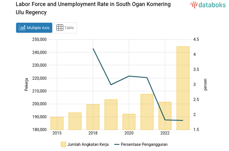 The reduction in the OUR this year can be seen from the number of the workforce and the number of employed people. The workforce in Ogan Komering Ulu Selatan Regency has shown an increasing trend over the past 15 years, continuing after the COVID-19 pandemic. Over the past four years, the number of the workforce has also shown an upward trend. In 2021, the workforce was recorded at 207,510 workers, increasing to 244,480 workers in 2023.