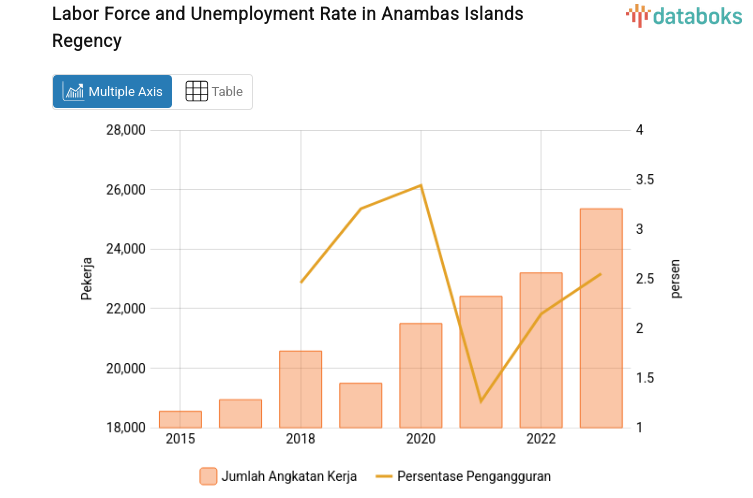 The increase in the open unemployment rate (TPT) is related to the number of the workforce in this region. The number of the workforce in Anambas Islands Regency has increased over the past three years. Historically, in 2021 there were 22,412 workers, increasing to 23,202 in 2022, and reaching 25,354 in 2023.