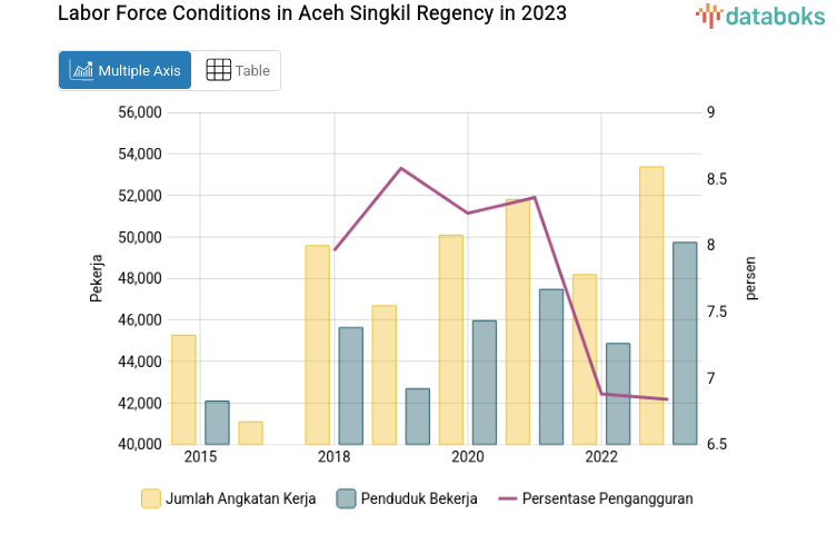 The decrease in the open unemployment rate (TPT) is reflected in the number of working people and the labor force published by BPS this year. The number of workers in Aceh Singkil Regency has increased over the past three years. Historically, in 2021 there were 51,807 workers, this decreased to 48,179 in 2022, and increased to 53,381 in 2023.