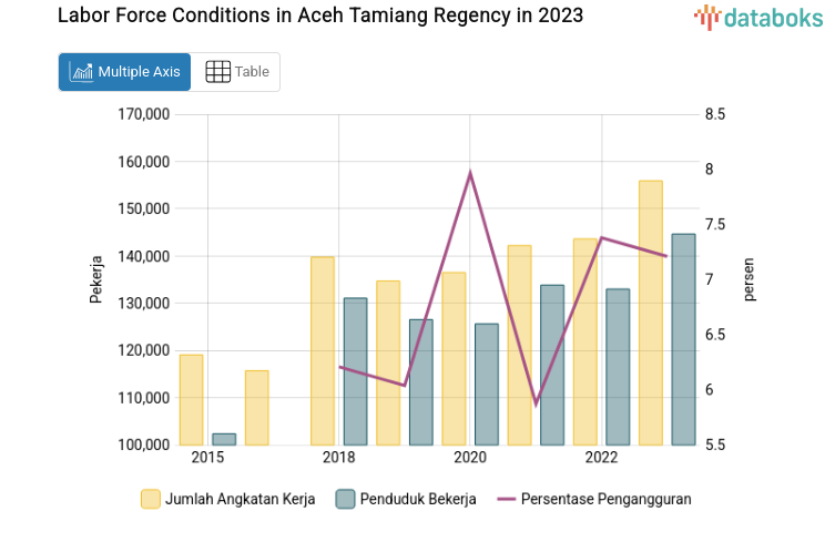 The number of workers in Aceh Tamiang Regency has increased over the last three years. Historically, in 2021 there were 133,870 workers, this number decreased to 133,030 in 2022, and increased to 144,660 in 2023.