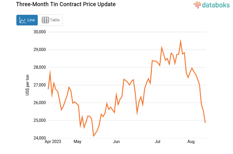 Tin Price Falls to US$24,860 per Ton on Tuesday, August 15, 2023