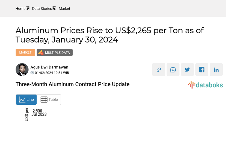 Aluminum Prices Rise to US$2,265 per Ton as of Tuesday, January 30, 2024