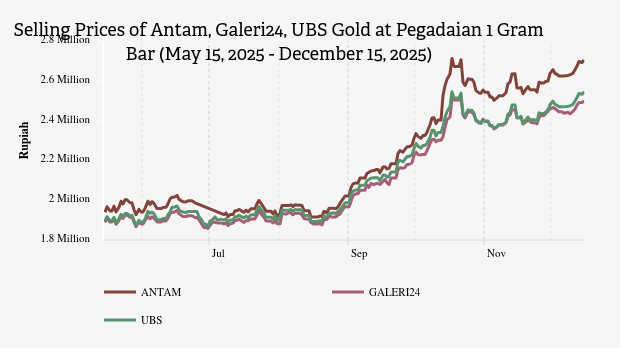 The prices of UBS, Antam, and Galeri24 gold at Pegadaian rose as of Monday, December 15, 2025.