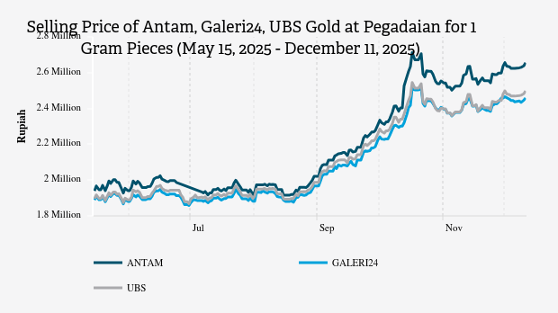 The price of Galeri24, Antam, and UBS gold at Pegadaian rose as of Friday, December 12, 2025.
