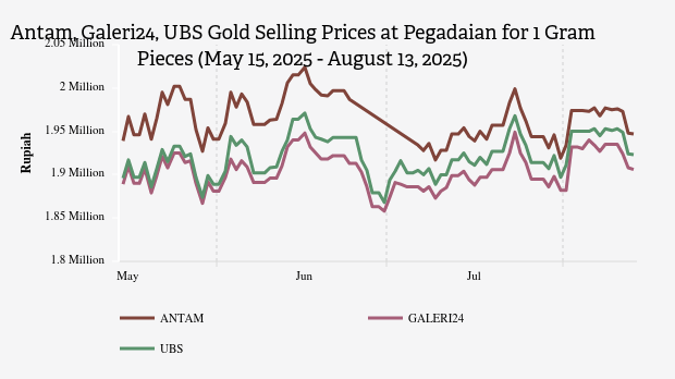 The prices of Antam, UBS, and Galeri24 gold at Pegadaian decreased as of Wednesday, August 13, 2025.