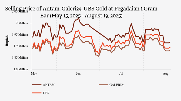 The price of Galeri24, UBS, and Antam gold at Pegadaian increased as of Tuesday, August 19, 2025.