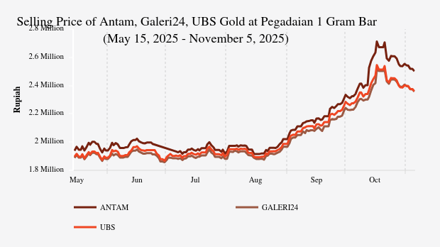 The prices of UBS, Antam, and Galeri24 gold at Pegadaian decreased as of Wednesday, November 5, 2025.