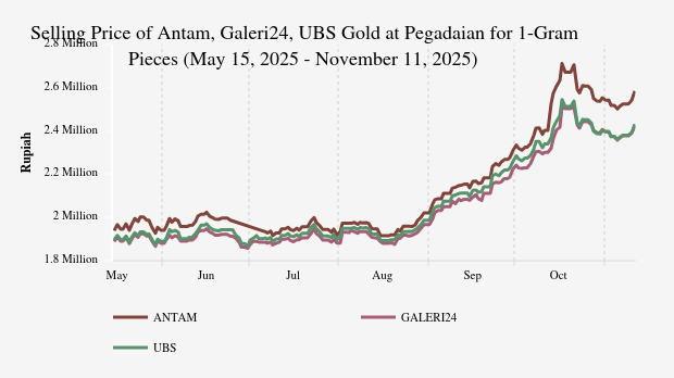 The prices of Antam, UBS, and Galeri24 gold at Pegadaian increased as of Tuesday, November 11, 2025.