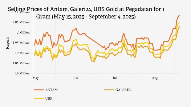 Gold prices for Galeri24, UBS, and Antam at Pegadaian rose as of Thursday, September 4, 2025.