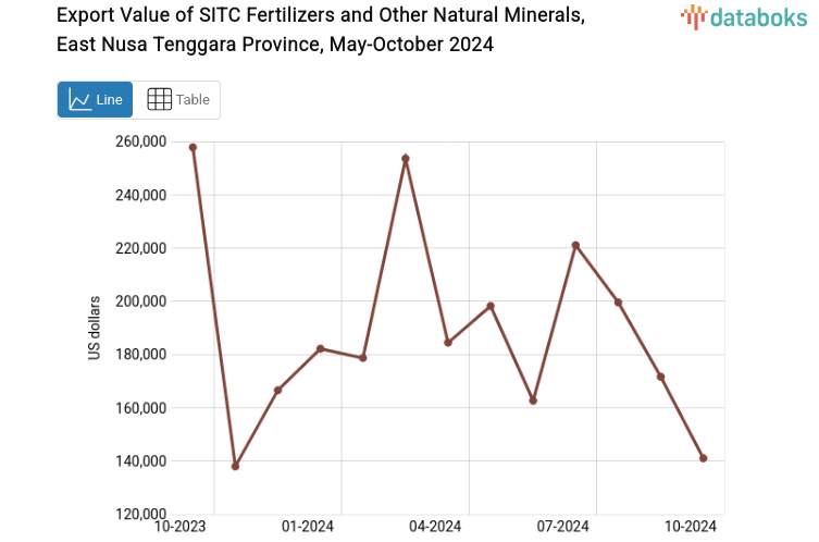 The value of exports of fertilizers and other natural minerals (SITC 27) from East Nusa Tenggara province in October 2024 decreased to US$141,110.