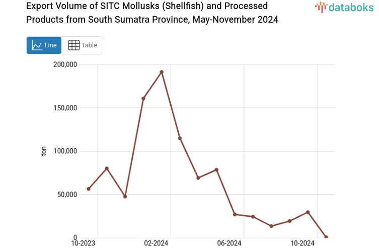 Export Volume of SITC Mollusks (Shellfish) and Processed Products from South Sumatra Province, May-November 2024