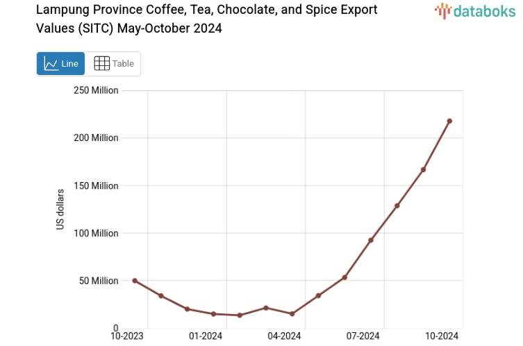 Lampung Province's October 2024 export value for SITC code 07 goods (coffee, tea, cocoa, and spices) increased to US$217.79 million.