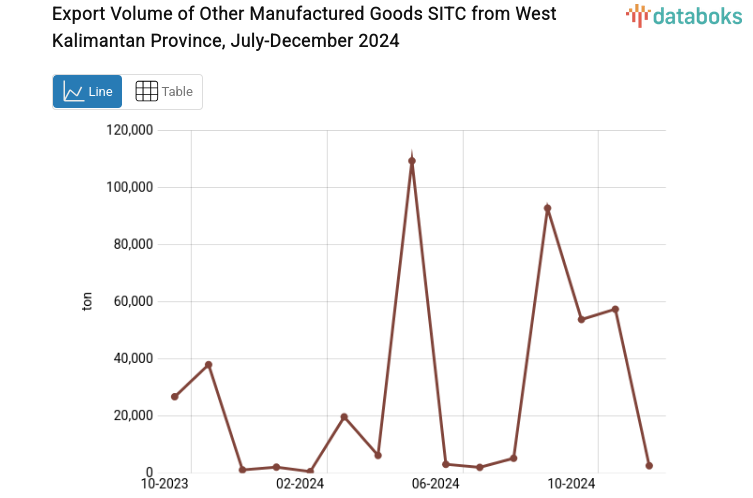 West Kalimantan Province recorded a total export volume of 359,770 tons in December 2024. Exports of other manufactured goods (SITC code 89) from the province in December 2024 decreased to 970 tons.
