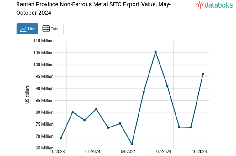 October 2024 export value of non-ferrous metals (SITC code 68) from Banten Province increased to US$96.07 million.