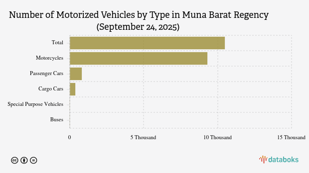 Muna Barat Regency had 10.47K motorized vehicles by Sept 2025. ERI Korlantas Polri data shows 9,297 motorcycles, 792 passenger cars, 373 cargo cars, 6 special purpose vehicles, and 1 bus. Kendari City