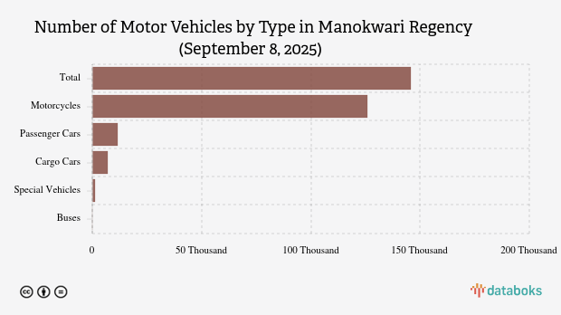 Manokwari Regency recorded 145.83 thousand motor vehicles in Sept 2025, led by 125.9 thousand motorcycles. This makes it the province''s highest, while Pegunungan Arfak Regency has the fewest with 230