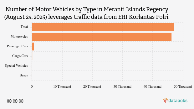 Meranti Islands Regency recorded 46.95K motor vehicles in Aug 2025, primarily motorcycles (46.12K). This was the lowest in Riau, compared to Pekanbaru City''s 1.24M. Data from ERI Korlantas Polri.