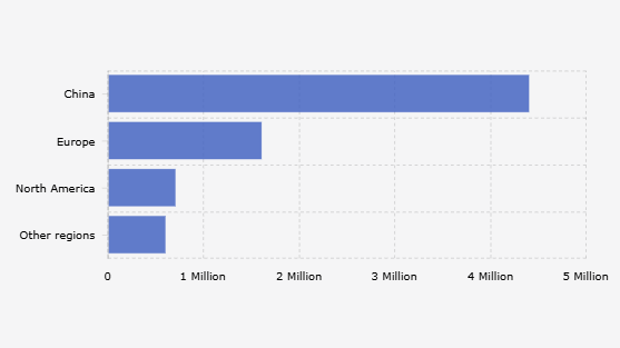 Next was Europe with 1.6 million units, North America with 700,000 units, and other regions with 600,000 units.