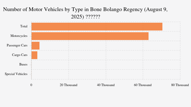 The number of motor vehicles in Bone Bolango Regency reached 70.4 thousand units in Aug 2025, with motorcycles being the most common, followed by passenger cars, cargo cars, buses, and special vehicle
