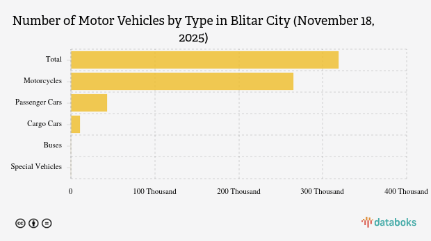 Blitar City recorded 319.16 thousand motor vehicles in November 2025. Motorcycles comprised 264.84 thousand units, passenger cars 42.99 thousand, cargo cars 10.97 thousand, buses 277, and special vehi