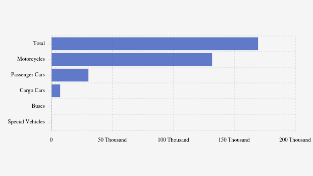 Kolaka Regency had 169.39K motorized vehicles in Sept 2025, with motorcycles dominating (131.83K). Passenger cars (30.14K), cargo cars (7,224), buses (118), and special vehicles (47) followed, accordi