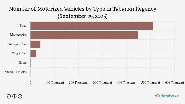 Tabanan Regency had 510.51 thousand motorized vehicles in Sept 2025, with motorcycles making up the majority (447.23k). Denpasar had the most, Bangli the fewest vehicles in the province.