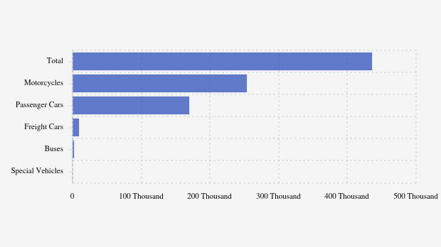 Bangkalan Regency had 435.33 thousand motor vehicles in Sept 2025, with motorcycles at 253.91K and passenger cars at 169.67K. Surabaya had the most vehicles, Pacitan the least in the province.