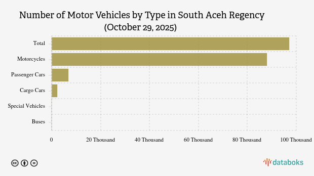 South Aceh Regency had 97.19 thousand motor vehicles in Oct 2025, with motorcycles making up 88.09 thousand units. Passenger cars, cargo cars, special vehicles, and buses follow in numbers.