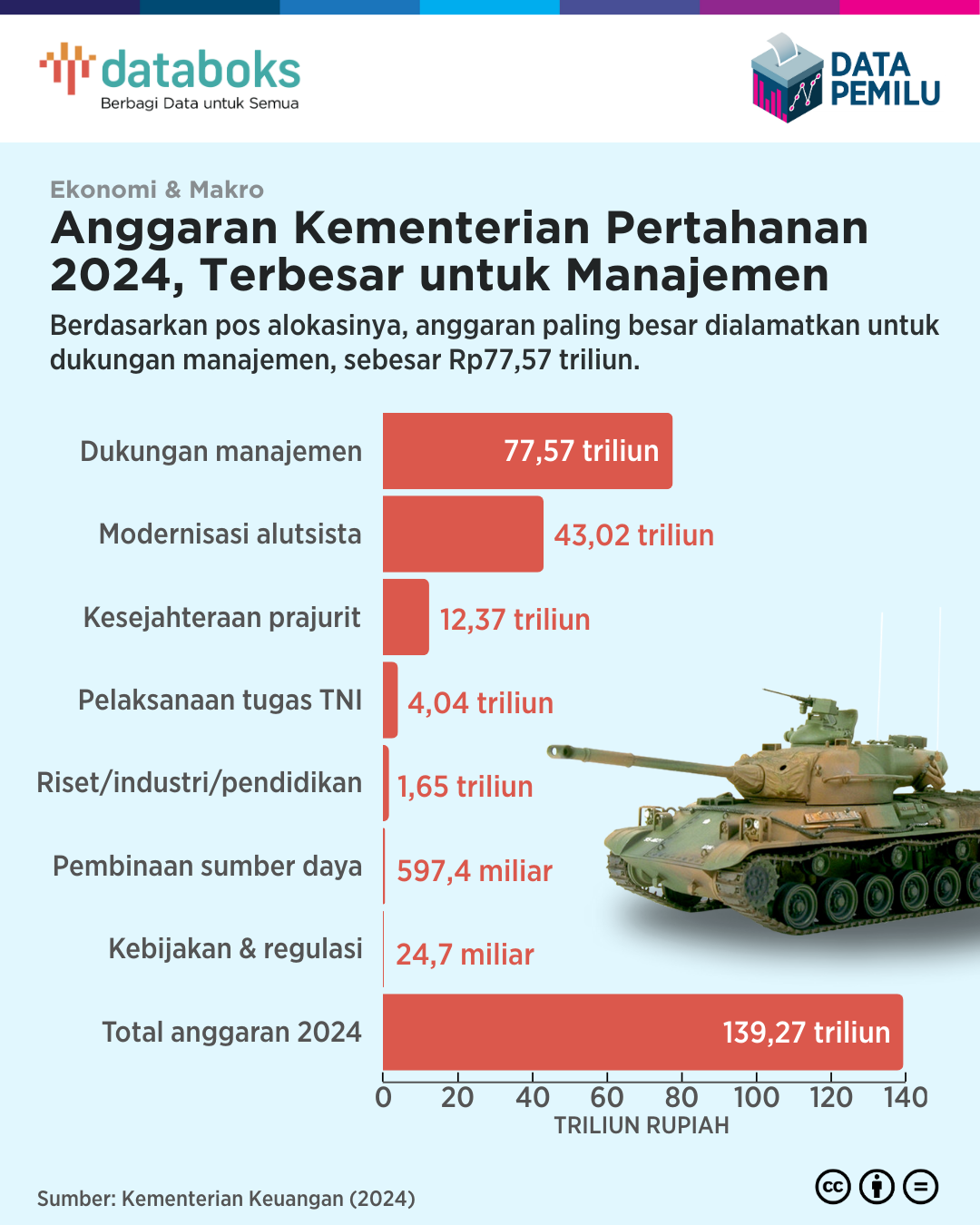 Kementerian Pertahanan (Kemenhan) mendapatkan alokasi anggaran Rp139,26 triliun dalam Anggaran Pendapatan dan Belanja Negara (APBN) 2024.