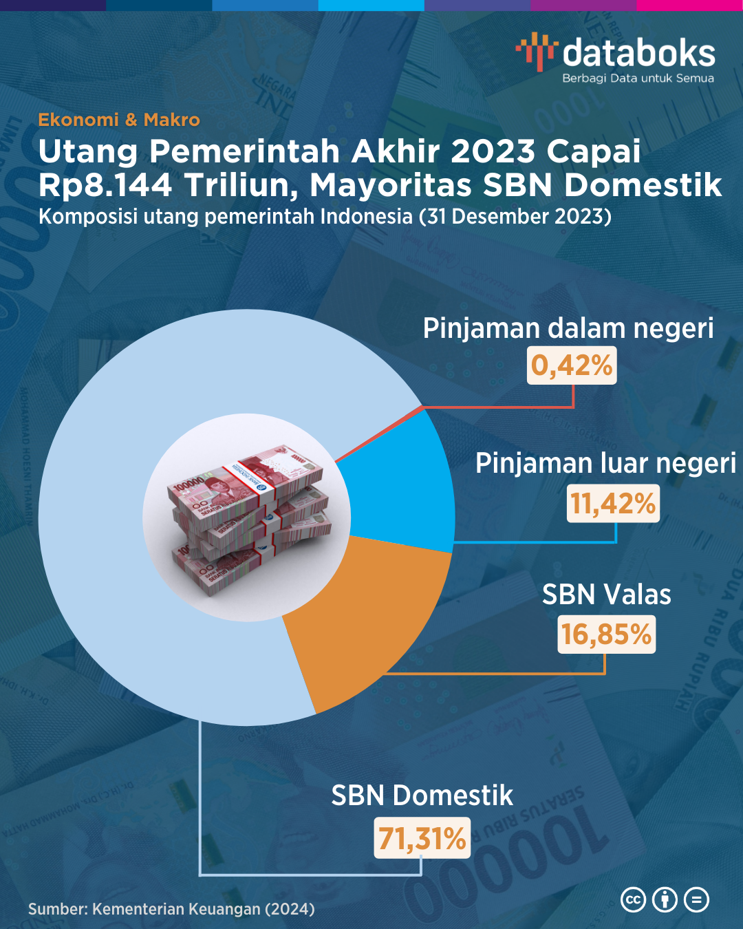 Menurut laporan Kementerian Keuangan, nilai total utang pemerintah Indonesia mencapai Rp8.144,69 triliun per tanggal 31 Desember 2023.
