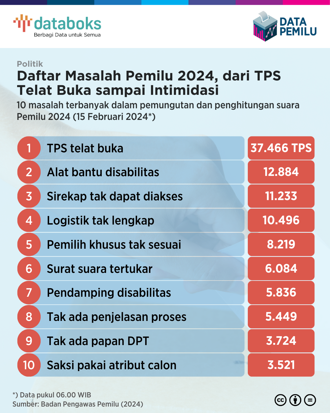 Anggota Bawaslu Lolly Suhenty menyebut, permasalahan yang paling banyak terjadi saat pelaksanaan Pemilu 2024 adalah tempat pemungutan suara (TPS) yang telat buka. Masalah ini ditemukan di 37.466 TPS.