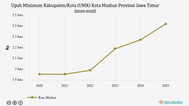 Merujuk data Badan Pusat Statistik (BPS) dan Pemerintah Daerah Jawa Timur, Upah Minimum Kabupaten/Kota (UMK) Madiun Kota Rp2.422.105 pada 2025.