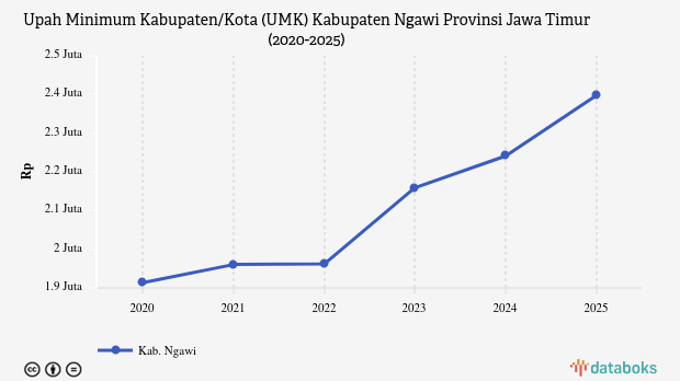 Melansir data Badan Pusat Statistik (BPS) dan Pemerintah Daerah Jawa Timur, Upah Minimum Kabupaten/Kota (UMK) Ngawi Rp2.397.928 pada 2025.