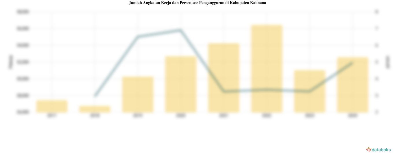 Naiknya tingkat pengangguran terbuka (TPT) tak terlepas dari data jumlah angkatan kerja di wilayah ini. Jumlah angkatan kerja di Kabupaten Kaimana mengalami trend kenaikan dalam 17 tahun terakhir sedangkan dalam lima tahun terakhir, jumlah angkatan kerja dalam tren turun. Tercatat pada tahun 2022 jumlah angkatan kerja sebanyak 36.375 pekerja kemudian jumlahnya mengalami penurunan menjadi 32.508 pekerja pada tahun 2024.