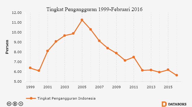 Jumlah pengangguran pada Februari 2016 mencapai 7,02 juta jiwa, lebih rendah dibandingkan posisi Agustus 2015 sebesar 7,56 juta jiwa dan juga lebih sedikit dibandingkan dengan posisi Februari 2015, yaitu 7,4 juta jiwa. Tingkat pengangguran Indonesia pernah mencapai level tertingginya di level 11,24 persen pada Agustus 2005.