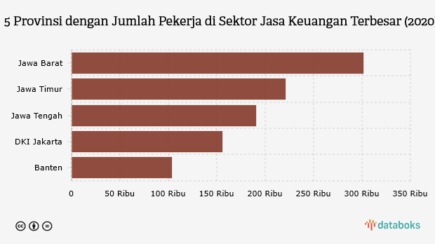 Badan Pusat Statistik (BPS) mencatat, jumlah pekerja sektor keuangan di Jawa Barat menjadi yang terbesar dibandingkan provinsi lain pada 2020. Jumlahnya mencapai 301,1 ribu orang atau setara dengan 20,2% dari totalnya secara nasional yang mencapai 1,49 juta orang.