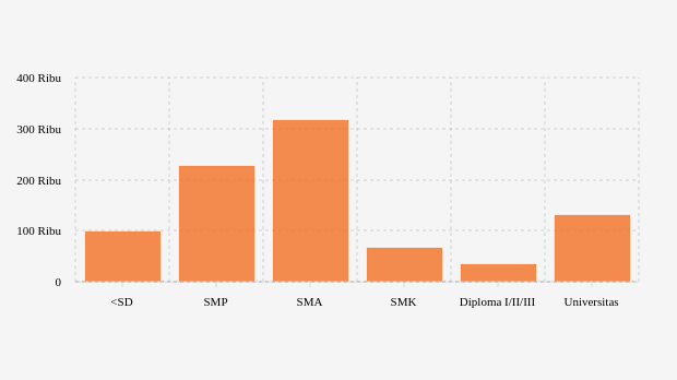 Kemudian pekerja terbanyak selanjutnya terdapat pada jenjang pendidikan SMA sebanyak 315,7 ribu dan SMP sebanyak 227 ribu. Adapun yang lulusan perguruan tinggi hanya sebanyak 34,4 ribu berasal dari Diploma I/III/III dan 131 ribu dari universitas.