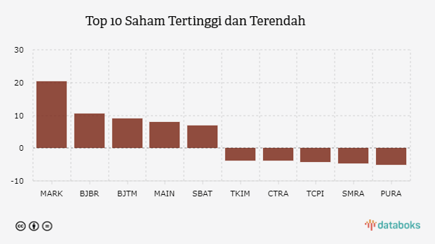 Dari 176 emiten yang nilainya meningkat hari ini, Mark Dynamics Indonesia (MARK) menempati posisi teratas sebagai yang paling besar peningkatannya yaitu 20,37%. Posisi ini disusul oleh Bank Pembangunan Daerah Jawa Barat dan (BJBR) yang meningkat 10,46% ke level 845 dan Bank Pembangunan Daerah Jawa Timur (BJTM) yang meningkat 9,0% ke level 545.
