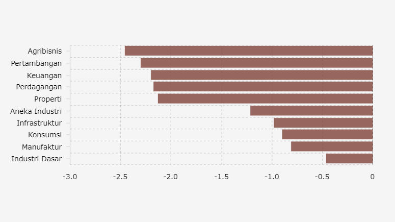 Pelemahan IHSG ini disebabkan oleh beberapa faktor seperti melemahnya sektor agribisnis dan pertambangan serta menurunnya harga saham-saham unggulan. Tercatat sektor agribisnis mengalami penurunan paling dalam yaitu sebesar -2,46%, disusul pertambangan yang melemah -2,3% dan keuangan yang melemah -2,2%.