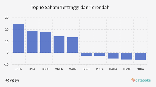 Dari 258 emiten yang nilainya meningkat hari ini, Kresna Graha Investama (KREN) menempati posisi teratas sebagai yang paling besar peningkatannya yaitu 24,68%. Posisi ini disusul oleh JAPFA (JPFA) yang meningkat 18,88% ke level 1165 dan Bumi Serpong Damai (BSDE) yang meningkat 17,91% ke level 790.