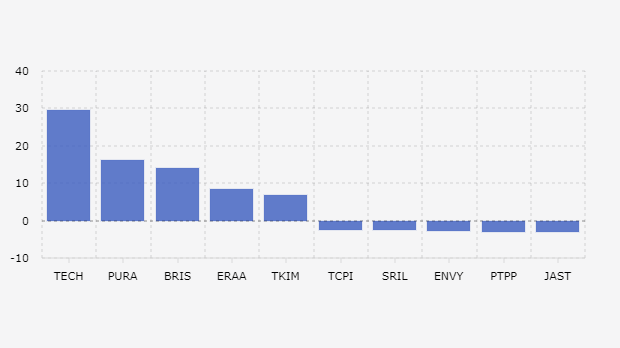 Dari sisi top gainer ada Indosterling Technomedia (TECH) yang naik sebesar 29,77% ke level 170, kemudian Putra Rajawali Kencana (PURA) yang naik 16,33% ke level 114. Total saham yang diperdagangkan hari ini adalah 10,13 miliar lembar saham dengan frekuensi transaksi sebanyak 711.911 kali.