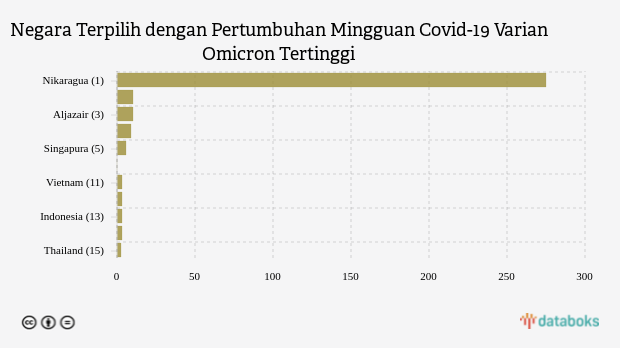 Berikutnya, Aljazair dengan penambahan kasus Omicron 221 kasus (naik 9,95%), penambahan kasus Omicron di Guatemala naik 8,97 persen menjadi 1.130 kasus dibandingkan pekan sebelumnya dan penambahan kasus Omicron di Singapura naik 5,58 persen menjadi 12.958 kasus dibandingkan pekan sebelumnya