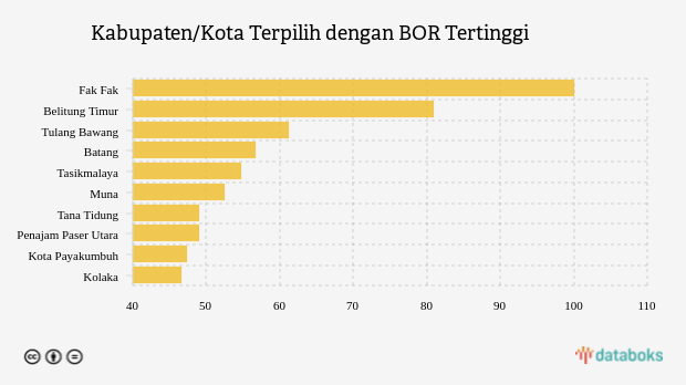 BOR khusus Covid-19 lima kabupaten/kota teratas dengan angka lebih dari 54,76 persen, yaitu Fak Fak, Belitung Timur, Tulang Bawang, Batang dan Tasikmalaya dengan masing-masing nilai 100 persen, 80,95 persen, 61,26 persen, 56,66 persen dan 54,76 persen.